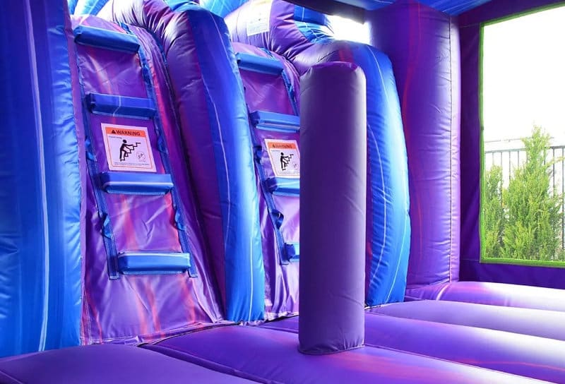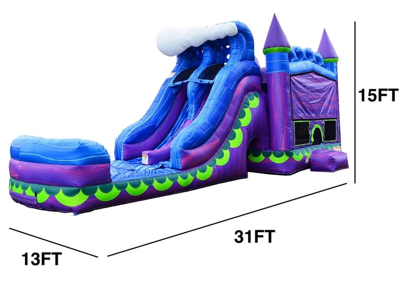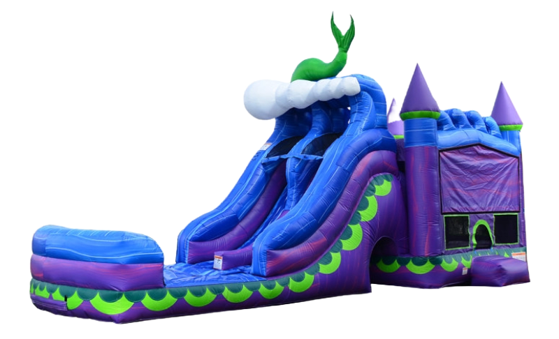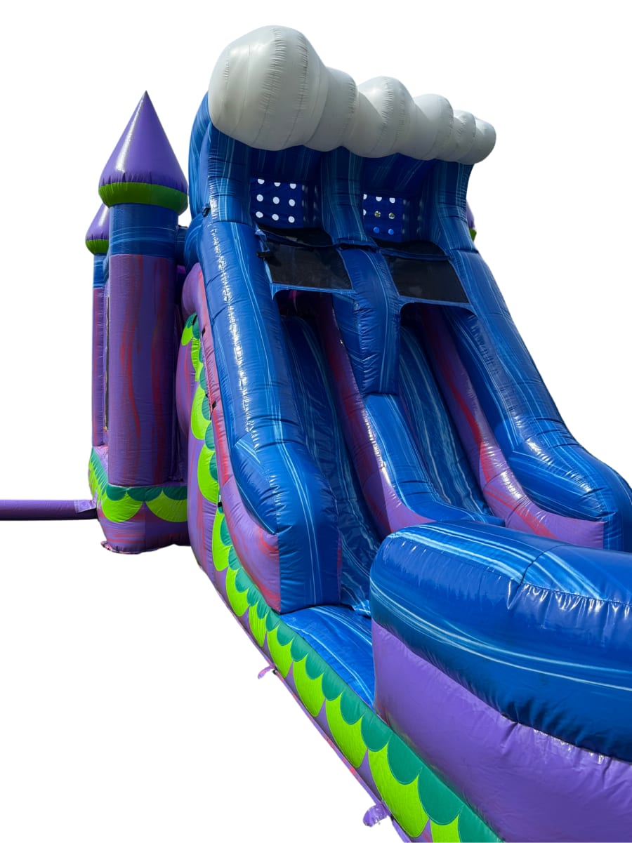 Check out our NEW Rip Tide 6-in-1 Combo! Ride the wave of excitement at your next event with the Rip Tide Combo. This vibrant inflatable features a dual lane water slide, bounce house, climbing wall, obstacle pop-ups, basketball hoop, and tunnel — offering six ways to play! With its bold aqua, blue, and purple ocean theme, the Rip Tide brings nonstop fun to any party. An optional inflatable mermaid tail adds an extra splash of ocean magic for themed events! Perfect for wet or dry use, you can enjoy this unit all year long.