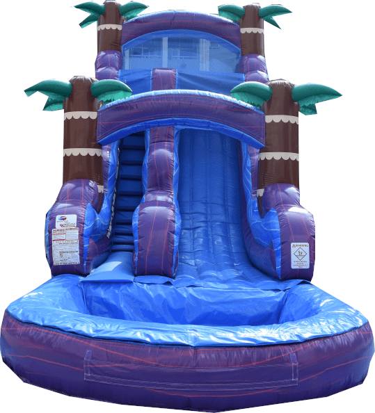 Make a splash with the ‘Purple Hurricane,’ an 18-foot tall waterslide that towers with tropical allure, complete with palm tree decorations. This 33-foot single-lane slide ends in a spacious splash pool, guaranteeing endless fun for thrill-seekers of all ages. Its striking purple design and island theme turn any party into a tropical paradise. Rent the Purple Hurricane for a memorable and exhilarating experience at your next event!